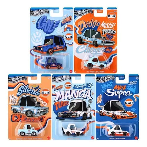 O Hot Wheels Silver Series Gulf é uma verdadeira obra de arte em miniatura, ideal para colecionadores exigentes e entusiastas de carros que apreciam a combinação de estilo, personalidade e qualidade. Cada modelo é cuidadosamente projetado e construído com materiais de alta qualidade, garantindo durabilidade e um acabamento impecável. O conjunto apresenta cinco modelos clássicos, reimaginados com o estilo Tooned característico da Hot Wheels. As proporções exageradas e os detalhes divertidos dão vida a esses carros icônicos, transformando-os em verdadeiras obras de arte em miniatura. Todos os modelos do conjunto ostentam a lendária pintura Gulf, com suas cores azul claro e laranja vibrante. Essa pintura icônica é um símbolo do automobilismo clássico e adiciona um toque de nostalgia e autenticidade a cada miniatura. 01 JCB62 Tooned Volkswagen Golf MK1: Um carro compacto alemão clássico, com um design simples e elegante, reimaginado com um toque Tooned. 02 JCB63 '70 Dodge Charger: Um muscle car americano clássico, com um design imponente e um motor potente. 03 JCB64 Toon'd '83 Chevy Silverado: Uma picape americana robusta e confiável, com um design divertido e exagerado. 04 JCB61 Manga Tuner: Um carro japonês com um design futurista e agressivo, perfeito para os amantes de carros tunados. 05 JCB65 '94 Toyota Supra: Um carro esportivo japonês icônico, conhecido por seu desempenho excepcional e design elegante. Recomendado para maiores de 3 anos Regulamentação Inmetro: 004644/2021 : 3 meses defeito fabricação Homologação Inmetro: IP-BRI-1421/2021-1