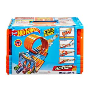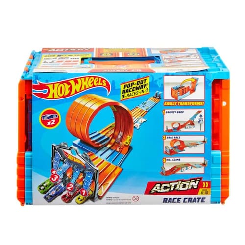 Hot Wheels Race Crate é o último edifício de corridas e dublês ambientado em um! Combina várias maneiras de jogar com 3 corridas emocionantes e únicas. As crianças podem correr, fazer looping e desafiar os amigos quando eles transformam este caixote super-legal em 3 desafios diferentes que incluem o Gravity Drop, Mega Jump e Drag Race! Acenda sua imaginação com o raceway pop-out, 8+ pés de pista e diferentes desafios que eles podem experimentar usando o portão de largada justo, loop de 2 pistas, portão de chegada e 2 lançadores de batidas duplas.
