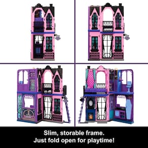 Monster High Casa de bonecas Boo-tique Hotel, conjunto dobrável com surpresas assustadoras em todos os cômodos e mais de 13 peças, incluindo móveis e acessórios - Descubra surpresas assustadoras em todos os cômodos do Monster High Boo-tique Hotel! Esta casa de bonecas possui 5 áreas de diversão para brincadeiras de 360 graus e mais de 13 peças de móveis e acessórios. - O design fino do hotel também facilita o armazenamento! Basta dobrar o conjunto ao meio com acessórios dentro e guardá-lo quando a hora de brincar acabar. - Descubra as surpresas uma a uma! Abra a geladeira da cozinha para um esqueleto de mão pop-up e a tampa do vaso sanitário para uma revelação engraçada de monstros! - Um espelho assombrado está pendurado na sala de estar - puxe a alavanca para ver um fantasma! Então, no quarto, há uma cama escondida onde monstros bichos podem dormir... além de uma cama de animal de estimação sob o telhado! - A diversão e os sustos não param por aí! As bonecas podem dormir de cabeça para baixo com a cama do caixão - um grito de vampiro se tornando realidade! Além disso, há uma varanda externa perfeita para uivar para a lua. - Não há lugar melhor para um fim de semana assustador do que o Monster High Boo-tique Hotel! Acessórios como mesas, cadeiras e utensílios de cozinha inspirarão todos os tipos de histórias legais assustadoras. - Precisa que alguns convidados entrem no hotel Compre a coleção Monster High de bonecas para ajudar a trazer este conjunto de brinquedos à realidade! As bonecas são vendidas separadamente, sujeitas à disponibilidade.
