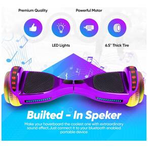 O hoverboard Emaxusa Roxo oferece diversão, estilo e segurança para crianças de 6 a 12 anos. As rodas estilo túnel totalmente LED proporcionam um show de luzes deslumbrante durante o passeio, adicionando visual e segurança ao trajeto. Certificado UL2272, atende aos mais altos padrões de segurança elétrica, de bateria e de carregamento, garantindo tranquilidade para os pais.