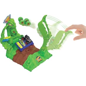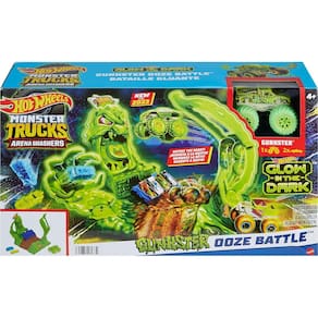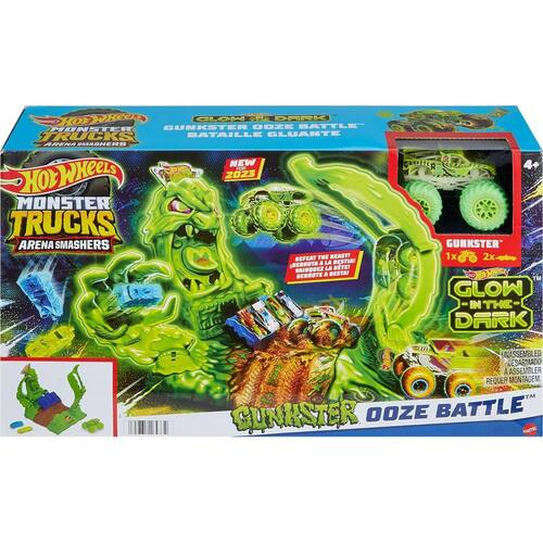 Lance o Gunkster que brilha no escuro na gosma iluminada para derrotá-la! Os pontos de colisão designados indicam às crianças onde é necessário mirar o Gunkster para derrotar o monstro de gosma. Tenha cuidado! Se bobear, o monstro da gosma vai atacar! A base se move e balança, permitindo que as crianças sintam o poder de esmagar e colidir em suas mãos. Encha as arquibancadas com carros adicionais de metal ou para esmagar, ou coloque os carros em pontos especiais no conjunto para ainda mais destruição. (Inclui 1 Hot Wheels Monster Truck Gunkster e 2 carros para esmagar, que brilham no escuro. Caminhões e carros adicionais vendidos separadamente.) As crianças podem combinar este conjunto a outros conjuntos Monster Trucks Arena Smashers para brincadeiras e aventuras sem fim.