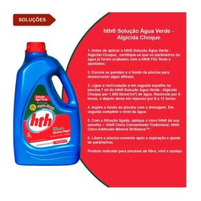 Instruções de uso 1. Antes de aplicar o hth® Solução Água Verde, certifique-se que os parâmetros da água já foram avaliados com a hth® Fita Teste e ajustados; 2. Escove as paredes e o fundo da piscina para desincrustar algas difíceis; 3. Ligue a recirculação e em seguida espalhe na piscina 7 ml do hth® Solução Água Verde por 1.000 litros (1m³) de água. Recircule por 6 horas, e depois deixe em repouso por 8 a 12 horas; 4. Aspire o fundo da piscina com a drenagem. Em seguida complete o nível da água; 5. Com a filtração ligada, aplique o cloro hth® da sua escolha – hth® Cloro Concentrado Tradicional, hth® Cloro Aditivado Mineral Brilliance™; 6. Libere a piscina somente após a aspiração e ajuste de parâmetros. Produto indicado para piscinas de fibra, vinil e azulejo.