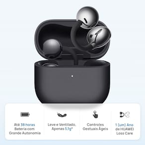 O HUAWEI FreeClip 2 é um fone de ouvido sem fio leve (5,1 g cada), com resistência à água IP57, bateria de até 38 horas com o estojo de carregamento e controles por gestos personalizáveis. Ele combina design compacto, áudio de alta qualidade e recursos inteligentes como cancelamento de ruído em chamadas e conexão simultânea com dois dispositivos.