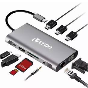 Hub adaptador 10 em 1: conectividade e versatilidade em um só dispositivo transferência rápida de dados: expanda sua velocidade de transferênciadesfrute de taxas de transferência de dados ultrarrápidas de até 5 gbps em todas as portas usb. Com essa velocidade, é possível transferir um filme em hd em questão de segundos. A porta gigabit ethernet suporta velocidades de rede de 10/100/1000 mbps, proporcionando uma experiência de internet tranquila. Além disso, as portas sd e tf suportam velocidades de transferência de dados de até 150 mbps, permitindo a leitura simultânea de cartões sd e tf. Extensão incrível: desfrute de vídeos em tela grandeaproveite a comodidade de assistir a filmes e vídeos em uma tela maior. Com a saída hdmi e vga do adaptador hub usb-c vedo, é possível desfrutar de vídeo 4k a 30 hz ou 1080p. Espelhe ou estenda sua tela para uma tv, monitor ou projetor e desfrute de uma experiência cinematográfica sem restrições de espaço. Carregamento rápido: energia sempre disponívelcom a porta de carregamento de 60 w, você pode alimentar seu computador, macbook pro ou outros dispositivos tipo c enquanto realiza transferências de dados. Equipado com chips avançados de núcleo duplo, o adaptador oferece excelente dissipação de calor e operação eficiente, garantindo proteção dupla para você e para o dispositivo. Com o hub adaptador 10 em 1, sua conectividade é ampliada e suas tarefas são simplificadas. Aqui, na eletrônica santana dados técnicos: Especificações - compatível com laptops meeste com interface tipo c - smartphones compatíveis com interface tipo c e função otg - interface 10 em 1: - 1 4k 3840 x 2160 / 30hz hd mi - 1 Vga - 1 Gigabit ethernet lan rj45 banda de reprodução de 10/100/1000mbps - 3 Usb 3.0 overdach de dados de alta velocidade, flash disk/muis/toetsenbord enzovoort - 1 Porta tipo c. - 1 Slot para cartão sd - 1 Slot para cartão tf - 1 Conector de áudio de 3,5 mm Compatibilidades - produto compatível com notebook, tablets, smartphones ou qualquer equipamento que possua entrada usb-c thunderbolt 3 ou usb c 3.2 gen 2. Homologação Anatel: 126732213457 Marca: Não Informado