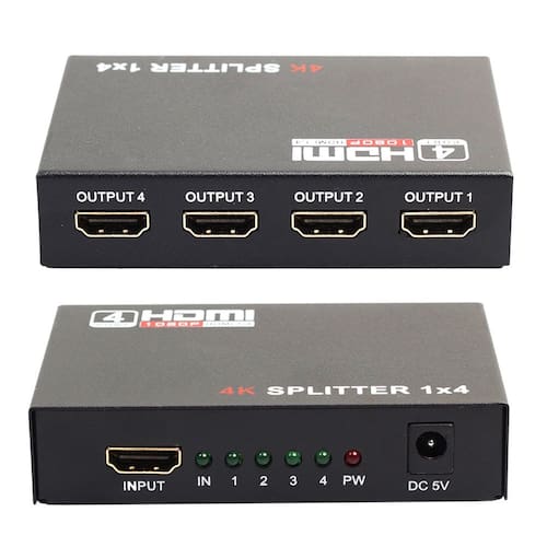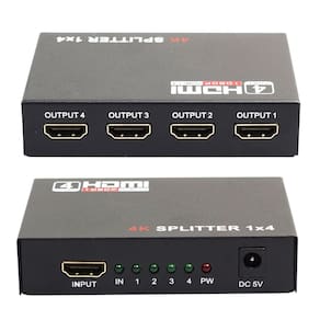 Divisor Hdmi 1x4 é possível ligar equipamentos como: PC, Bluray, TV à cabo, video games e etc, e duplicar a mesma imagem para 4 televisores ou projetores. Distribui uma entrada em 4 saídas Hdmi idênticas, e sincronizadas. Tem a capacidade de buffer amplificando com alcance de transmissão de sinal HDMI até 15 metros Fácil de usar Plug and Play Aplicação: Switch / Splitter de fontes de video digital 2/4 DVI ou de audio digital Hdmi Tela digital, monitoes de tela plana Hdmi, Hdtv Players de DVD, de satelite, sel top boxes Projetores digitais de audio e video Outros dispositivos habilitados para Hdmi Caracteristicas: 1 Entrada e saida 2/4 splitter Aprovado pelo HDMI attached lab Suporta totalmente Hdtv 1080p Compativel com HDCP Suporte DTS doby , 7.1 canais de audio Conectores banhados Plug and Play Função amplificador e equalizador para aumentar o cabo Hdmi O pacote inclui: 1 Divisor Hdmi 1 Fonte de alimentação 5V DC 1 Manual de instruções