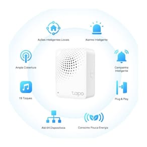 Descricao Tapo H100 | Hub Inteligente com CampainhaConexoes Confiaveis de Longo Alcance - Mantenha os subdispositivos conectados o tempo todo por meio da rede sem fio robusta.Protocolo Wireless de Baixo Consumo de Energia - Seus dispositivos conectados funcionam de forma eficiente e consomem pouca energia, prometendo um tempo de espera mais longo. Alarme Inteligente - Trabalha em conjunto com os sensores inteligentes Tapo para alertar sobre perigos ou dissuadir intrusos.Campainha Inteligente - Combine-o com o Botao Inteligente Tapo para criar seu sistema de campainha inteligente, com 19 opcoes de toques para escolher.Ecossistema Tapo - Conecte ate 64 dispositivos inteligentes para uma experiencia completa de casa inteligente.Conheca o Coracao da sua Casa Inteligente : Hub Inteligente com Campainha- Longo Alcance- Acoes Inteligentes- Alarme Inteligente- Campainha Inteligente- 19 Toques- Ate 64 Dispositivos- Wireless de Baixa Energia- Plug & PlayConecte Muito Usando Pouca EnergiaO Tapo Hub e o coracao da sua casa inteligente Tapo, conectando dispositivos como sensores inteligentes, interruptores e botoes, usando um protocolo sem fio de ultra baixa potencia. Essa tecnologia ajuda os dispositivos alimentados por bateria a durarem ate 10 vezes mais.[1]Conexoes de Longo Alcance ConfiaveisO Tapo Hub transmite sinais em uma faixa de frequencia mais baixa e menos congestionada, o que permite alcancar de forma confiavel dispositivos em todos os comodods da sua casa sem interferencias. [2]Acoes Inteligentes com Sensores, Interruptores e BotoesCom o Tapo Smart Hub H100, voce pode acionar um Atalho ou controlar dispositivos Tapo (como tomadas inteligentes, luzes inteligentes e interruptores inteligentes) com base na deteccao do sensor ou com um toque no botao.(*O Tapo H100 nao pode se conectar diretamente a tomadas inteligentes Tapo ou iluminacao inteligente Tapo.)Proteja sua casa dia e noite.Trabalhando em conjunto com sensores de movimento Tapo, sensores de porta/janela e outros, o Tapo Hub pode emitir um alarme (de ate 90 dB) para alertar sobre perigos ou dissuadir intrusos.Hub Tapo + Sensor de Movimento Inteligente + Sensor de Contato Inteligente*O Smart Motion Sensor e o Smart Contact Sensor sao vendidos separadamente.Mantenha sua casa sempre confortavel.Trabalhando em conjunto com os sensores ambientais da Tapo, o Hub Tapo ajuda a monitorar os niveis de conforto da sua casa. Voce recebera um alarme instantaneo do hub quando forem detectados vazamentos de agua ou quando os niveis de temperatura e umidade sairem dos intervalos estabelecidos.Hub Tapo + Sensor de Temperatura e Umidade Tapo + Sensor Inteligente de Vazamento Tapo19 ToquesEscolha entre uma grande variedade de toques para encontrar o som perfeito para cada situacao.Som AjustavelAjuste o volume em 3 niveis diferentes (Alto, Normal, Baixo) de acordo com a necessidade de cada ambiente.Todos os dispositivos em um unico hub.Cada Hub Tapo pode se conectar a ate 64 dispositivos Tapo em toda a sua casa.[3]Monte seu proprio ecossistema de dispositivos inteligentes e gerencie tudo com o Aplicativo Tapo.Ate 64 Dispositivos[3]Instalacao Rapida e Simples1 - Baixe o App Tapo2 - Conecte na tomada & Ligue seu Hub Tapo3 - Adicione um Acessorio Tapo & Crie uma Acao Inteligente*Imagens meramente ilustrativas.Especificacao Tecnica RedeProtocolos868 / 922 MHzTipo de Wireless2.4GHz Wi-FiGeralTemperatura de Operacao0~40CDimensoes (L*C*A)72 x 62.5 x 51 mm(2.8 x 2.5 x 2 inch)Material UL94-V0 Retardante de ChamasBotoes Botoes de SYNC/MudoRequerimento de Energia AC, 100~240V, 50/60HzCONTEUDO DO PACOTEConteudo do pacote1 x Tapo H1001 x Guia de Inicializacao Rapida
