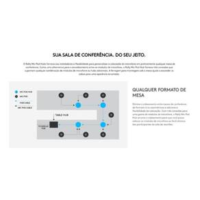 SUA SALA DE CONFERÊNCIA. DO SEU JEITO. O Rally Mic Pod Hubs fornece aos instaladores a flexibilidade para personalizar a colocação do microfone em praticamente qualquer mesa de conferência. Como uma alternativa para o encadeamento entre os módulos de microfone, o Rally Mic Pod Hub fornece três conexões que suportam qualquer combinação de módulos de microfone ou hubs adicionais. A ferragem para montagem sob a mesa ajuda a esconder os cabos para uma aparência arrumada. QUALQUER FORMATO DE MESA Elimine o cabeamento entre mesas de conferência de formato U ou assimétricas e adicione a flexibilidade de colocação. Com três conexões para uma gama de módulos de microfone, o Rally Mic Pod Hub arruma o cabeamento para que você possa colocar os módulos de microfone ao fácil alcance dos participantes da sala de reuniões. CABEAMENTO OCULTO Elimine o cabeamento entre mesas e entre módulos de microfone ao conectá-los através de ilhós aos hubs abaixo da mesa. Isso mantém os cabos de áudio fora da vista para uma aparência profissional. MOBILIDADE DO MÓDULO DE MICROFONE O Rally Mic Pod Hub permite que você conecte cada módulo de microfone através de um único cabo. Quando os participantes da reunião desejam mover um módulo de microfone para um espaço livre na mesa ou para colocar o controle de mudo ao fácil alcance, eles o podem fazer sem puxar os módulos de microfone vizinhos. Diferente de sistemas que requerem posições de microfone fixas, o Rally recalibra automaticamente a RightSound™ Mic Matrix 125 vezes por segundo para o cancelamento consistente de eco. supressão de ruído e desempenho de formação de feixe. REQUISITOS DE SISTEMA: -Logitech Rally ou Logitech Rally Plus -Observação: o Rally Mic Pod Hubs funciona com os sistemas Logitech Rally, e não são compatíveis com a USB Rally Camera independente. ESPECIFICAÇÕES: -Três conexões de 12 pinos para qualquer combinação de Rally Mic Pods ou Rally Mic Pod Hubs adicionais -Ferragem para montagem sob a mesa CONTEÚDO DA EMBALAGEM -Mic Pod Hub -Ferragem para montagem -Documentação de hardware limitada de dois anos Marca: Não Informado