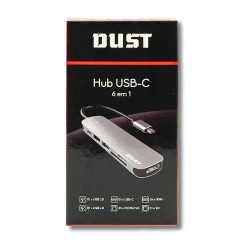 Hub USB-C 6 em 1 da Dust é a solução ideal para você que possui poucas portas disponíveis para conectar seus dispositivos/periféricos na hora de usar seu computador, notebook ou celular que sejam compatíveis com a interface Tipo-C. Este modelo permite conectar até seis dispositivos simultaneamente, como mouse, teclado, pendrive, cartão SD, micro SD, HDMI e etc.