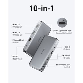 - Grande expansão de 10 portas: equipado com 2 portas HDMI, uma porta upstream USB-C (conectada ao laptop), uma porta de dados USB-C, 2 portas de dados USB-A, slots para cartões SD e microSD, uma porta Ethernet e uma porta PD-IN de no máximo 100 W.