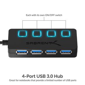 Hub USB 3.0 Sabrent com interruptores e LEDs individuais - Expansibilidade: adicione instantaneamente 4 portas USB 3.0 a qualquer dispositivo compatível. O cabo de 60 cm permite uma configuração flexível e fácil acesso a portas difíceis de alcançar. - Design amigável ao usuário: os indicadores LED mostram o status de energia de cada porta. Interruptores individuais liga/desliga permitem conectar/desconectar dispositivos sem esforço. - Transferência de dados de alta velocidade: suporta velocidades de até 5 Gbps (USB 3.0), 480 Mbps (USB 2.0) e 12 Mbps (USB 1.1). Transfira arquivos grandes em segundos. - Ampla compatibilidade: funciona com dispositivos USB 2.0 e USB 1.1. Compatível com PC, MacBook, iMac, Mac mini, XPS, Flash Drives e muito mais. - Fácil instalação: sem necessidade de driver; Plug & Play e troca a quente. Observação: não serve para carregar.