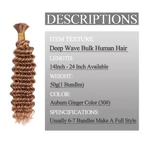 Cabelo humano a granel para trançar textura: cabelo humano a granel ondulado profundo para trançar gengibre ruivo, cabelo humano trançado para tranças Material do cabelo humano ondulado profundo: 100% cabelo humano virgem brasileiro não processado, macio e saltitante, fácil de tingir e estilizar Cor do cabelo humano encaracolado: #1B, #Castanho Chocolate, #27, Gengibre Auburn (#30), #P4/27 em estoque, pode ser tingido para a maioria das cores Comprimento do cabelo trançado humano a granel profundo: 35-61 cm pode estar disponível, pode ser comprado em diferentes combinações de comprimento Qualidade das extensões de cabelo humano trançadas: 12A cabelo humano de alta qualidade, o cabelo humano molhado e ondulado é durável - Especificações do Deep Wave Bulk Auburn Ginger 30#: (50g/1 pacote) e (100g/2 pacotes) podem ser escolhidos, 35-61 centímetros disponíveis, você pode escolher a quantidade e o comprimento deles de acordo com o penteado que deseja obter (mais pessoas optam por comprar 100 g + 50 g) - Qualidade de cabelo humano a granel ondulado: 12A 100% extensões de cabelo humano virgem brasileiro não processado para trançar, sem trama de ondas profundas, sem queda, sem emaranhamento, macio e saltitante, fácil de trançar - Comprimento real e cor do cabelo humano trançado: #1B, #Chocolate Brown,#27,Auburn Ginger(#30), #P4/27 em estoque, fácil de tingir para a maioria das cores. 35 a 61 cm podem estar disponíveis, todos podem escolher combinações de comprimento e cor de tinta de acordo com diferentes necessidades de estilo - Longa duração do cabelo humano encaracolado profundo: com base no material de cabelo humano de alta qualidade 12A, o cabelo humano molhado e ondulado é durável de forma justa. Pode manter a textura de ondas profundas por um longo tempo - Uma ampla variedade de estilos de uso com volume de ondas profundas: sem trama de cabelo humano para trançar gengibre ruivo, pode ser utilizado para fazer tranças boêmias, tranças sem nós, tranças e assim por diante. Adequado para encontros, viagens, formatura e aniversário