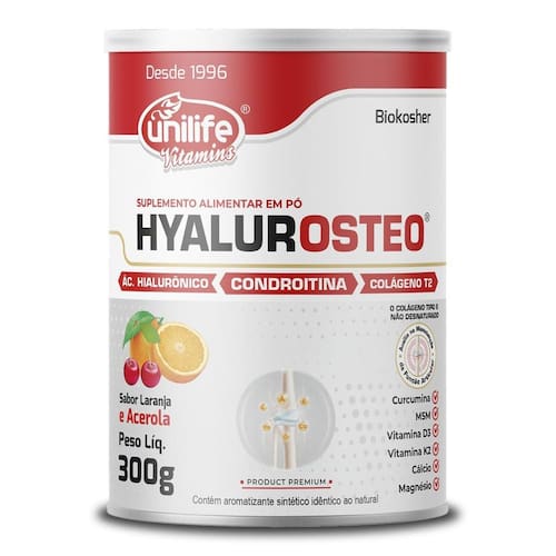 O Hyalurosteo é um produto premium da Unilife. Um combinado de Ácido Hialurônico, Condroitina e Colágeno Tipo II Não Desnaturado que auxiliam na manutenção da função articular. Conta também em sua composição com: Metilsulfonilmetano MSM , Curcumina, Vitamina D3, Vitamina K2, Magnésio e Cálcio. Ação antioxidante e reforço nas defesas naturais do organismo. Sabor Laranja e Acerola.