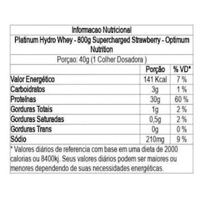 O Whey Platinum Hydro 800g Optimum Nutrition foi reconhecido por milhares de consumidores como o mais inovador suplemento. A tecnologia de proteína de absorção mais rápida, mais pura e mais avançada do mercado de suplementos. Por hidrolizar a proteína nesta fórmula premium, a Optimum Nutrition criou whey protein de ação mais rápida.Além de ser rápido, Platinum Hydro Whey é também ultra-puro. Isso porque ele é feito inteiramente com whey protein isolada. Portanto, não há excesso de gordura, colesterol ou lactose para retardar o seu progresso de absorção.Feito com Whey Protein Isolada Hidrolisada Avançada para uma absorção muito mais rápida e eficiente.------------------------------------------------------------------------------------------------------------Marca: Optimum NutritionModelo: Whey Platinum HydroTipo: Suplemento alimentarVolume: 800gBENEFÍCIOS:Rápida absorçãoProteína HidrolisadaReconstrução MuscularEnzimas DigestivasAminoácidos de cadeia ramificada BCAAs Além de ser rápido, Platinum Hydro Whey também é ultra-puroMODO DE USO:Misturar uma colher-medida de Platinum Hydro Whey Optimum Nutrition em 300 ml de água. Ingerir diariamente.INGREDIENTES:Proteína de soro do leite isolada hidrolisada, óleo de girassol, maltodextrina, amido modificado, sal, lecitina de soja estabilizante , fosfato dipotássico regulador de acidez , fosfato tricálcico antiumectante , celulose microcristalina estabilizante , acessulfame K edulcorante artificial e sucralose edulcorante artificial , aroma natural e artificial. Marca: On optimum-nutrition