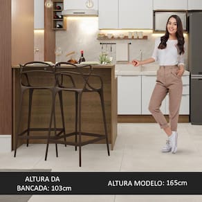 Combinando uma bancada e um balcão com duas portas, a ilha se torna um ótimo local para refeições rápidas no dia a dia. Além disso, é super espaçosa, ideal para preparar alimentos e armazenar utensílios, panelas e alimentos.