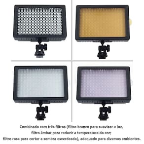 • 160 leds • Indicador de carga da bateria • Botão giratório para ligar/desligar e ajustar o brilho • Dimmer para regular a intensidade da luz • Encaixe com rotação para direcionar a luz • Acompanha 3 filtros adequados para diversos ambientes: branco para suavizar a luz, âmbar para reduzir a temperatura da cor; rosa para cortar a sombra esverdeada