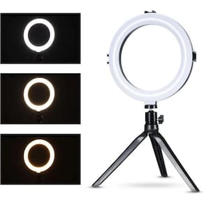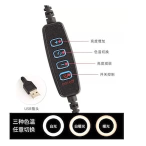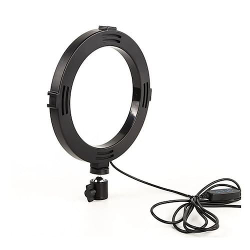 Iluminador Ring Light Usb 20Cm Video Foto 8'' Com Tripé Mesa Com suporte para celular para usar tanto na horizontal quanto na vertical. Tem 3 encaixes para o suporte de celular ao redor da ring light 8 polegadas. O iluminador de led circular ring light permite obter uma luz suave e quase sem sombras devido ao seu formato circular. A luz obtida por esse produto produz resultados espetaculares em tons de peles, tornando-o ideal para fotografias e vídeos em que deseja-se destacar a pele, maquiagem, corte de cabelo, unhas e detalhes em geral. Uso doméstico e profissional. Fácil de usar, durável e de pouco peso, facilitando o transporte. O encaixe do ring ligth é através de encaixe padrão de tripés de rosca. O mini tripé também serve para utilizar em outros equipamentos de até 1kg de peso, como projetores, celulares e etc. Você pode ajustar o ângulo da iluminação por possuir um suporte articulado. Na frente dos leds tem um filtro difusor para suavizar a luz espalhando a luz com maior uniformidade. É possível ajustar a intensidade da luz através do botão que acompanha no controle e trocar a cor da luz branco-quente, branco-frio. Intermediária . Ajuste de intensidade 0 - 100% Controle: liga/desliga Troca a cor da luz Ajuste da cor vai de 3200k à 5500k. Ângulo regulável. Especificações: Fonte de luz 64 lâmpadas de led Potência 10w Peso aprox. 0,500 kgs. Alimentação: usb - diâmetro do círculo de luz: 20 cm - altura total: 40 cm - temperatura da luz: quente, fria e intermediária - conexão usb - regulagem da intensidade de luz - apoio de tripé ajustável Itens inclusos: 1x iluminador led circular 1x mini tripe 1x cabo usb com controle não acompanha caixinha do carregador, pode carregar na caixinha do celular . Bivolt 1x suporte para celular Medida da embalagem: c= 19 cm a=22 cm l= 4 cm Produto não recarregável só funciona conectado a energia Ean: 2010000010624
