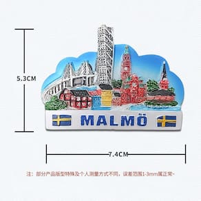 Material: Resina Tamanho: 7,4 x 5,3 cm Peso: 60 g/Malmö Landmark Design: apresenta uma representação em resina 3D do icônico horizonte de Malmö, incluindo o edifício Turning Torso, capturando o charme moderno e histórico da cidade. Material de resina durável: feito com resina de alta qualidade, garantindo que o ímã seja resistente e retenha cores vibrantes para um apelo duradouro. Lembrança perfeita de Malmö: Uma ótima lembrança da Suécia, ideal para viajantes e aqueles que desejam comemorar sua visita a Malmö. Decoração versátil: perfeita para geladeiras, armários, quadros brancos ou qualquer outra superfície magnética em sua casa, cozinha ou escritório. Compacto e leve: medindo 7,4 x 5,3 cm e pesando apenas 60 g, esse ímã tem o tamanho ideal para exibição sem ocupar muito espaço.