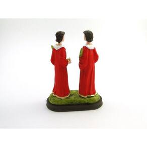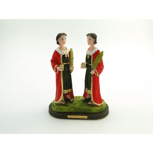 Imagem Cosme e Damião Resina 15 cm Cosme, Damião e Doum: Eram trigêmeos, mas Doum morreu ainda criança, e isso fez com que Cosme e Damião se tornassem médicos, curando as pessoas sem cobrar, apenas por caridade. Dimensões: altura: 15 cm - Largura: 11 cm - Profundidade: 6 cm Dimensões aproximadas do produto. Produto pintado a mão, podendo sofrer variações de cores. Marca: Não Informado