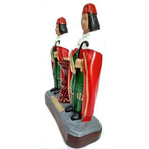 Os Santos Cosme e Damião, irmãos gêmeos, morreram por volta de 300 d.C. Crê-se que foram médicos, e sua santidade é atribuída pelo motivo de haverem exercido a medicina sem cobrar por isso, devotados à fé. Na Igreja Católica sua festa é celebrada no dia 26 de setembro, de acordo com o atual Calendário Litúrgico Romano do Rito Ordinário, e no dia 27 de setembro, pelo Calendário Litúrgico Romano do Rito Extraordinário. Na Igreja Ortodoxa são celebrados no dia 1 de novembro e também em 1 de julho pelos ortodoxos gregos. Nas religiões afro-brasileiras, onde são sincretizados como entidades infantis, também são festejados em 27 de setembro. Imagem Escultura de Cosme e Damião em gesso maciço com pintura artesanal. Possui 15 cm. Fotos reais do produto. A imagem que você receberá é exatamente a da foto. Produtos exclusivos EVANGELIZE Marca: Evangelize