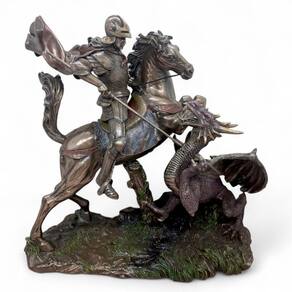 Destaques do Produto: Design realista e impactante – São Jorge montado em seu cavalo, em batalha contra o dragão. Acabamento em bronze envelhecido – visual nobre e elegante. Altura de 27 cm – tamanho ideal para decoração ou altar pessoal. Feita em resina resistente – durabilidade e riqueza nos detalhes. "São Jorge, guerreiro da luz, protegei-nos em todas as batalhas."