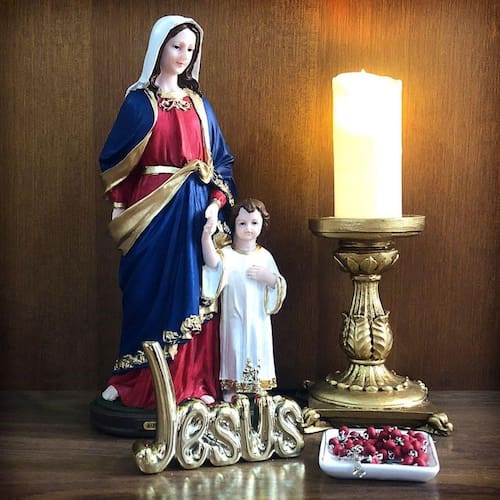 Imagem Maria Passa na Frente Resina 30 cm Maria Passa na frente e resolve aquilo que somos incapazes de resolver. Dimensões: altura: 30 cm - Largura: 14 cm - Profundidade: 9 cm Dimensões aproximadas do produto. Produto pintado a mão, podendo sofrer variações de cores. Marca: Não Informado