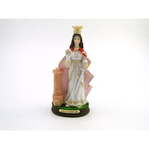 Imagem Santa Bárbara Resina 15 cm Santa Bárbara ganhou o status de protetora contra relâmpagos e tempestades, além de ser nomeada Padroeira dos artilheiros, dos mineradores e das pessoas que trabalham com fogo. Dimensões: altura: 15 cm - Largura: 7 cm - Profundidade: 6 cm Dimensões aproximadas do produto. Produto pintado a mão, podendo sofrer variações de cores. Marca: Amém Decoração Religiosa Ean: 7890499230933