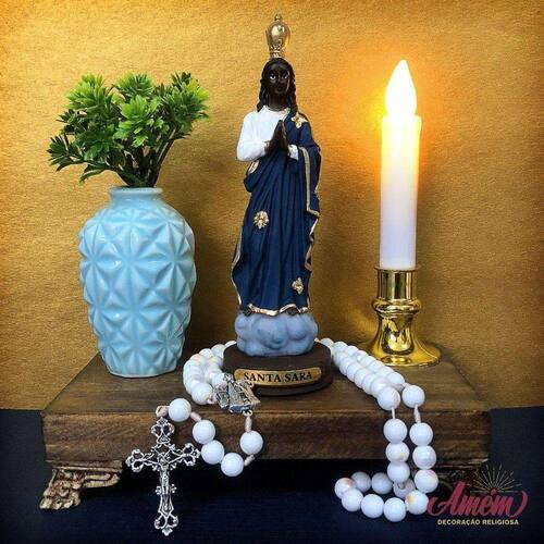 Imagem Santa Sara Resina 14 cm Santa Sara de Kali, padroeira do povo cigano, das mulheres que querem engravidar, do bom parto, dos exilados e dos desesperados. Dimensões: altura: 14 cm - Largura: 5 cm - Profundidade: 5 cm Dimensões aproximadas do produto. Produto pintado a mão, podendo sofrer variações de cores. Marca: Amém Decoração Religiosa Ean: 7890499231091