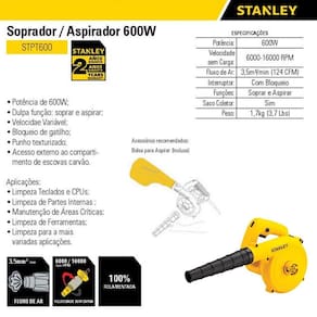 SOPRADOR ASPIRADOR 600W 127V STANLEYDescrição:Soprador / aspirador 600w STPT600-BR, que traz em sua composição poliamida e fibra de vidro.Ideal para limpeza de quintal, galpões e sucções leves após o corte de gramas, folhas e outros detritos.Especificações Técnicas:Potência: 600WRotações por minuto: 6.000 - 16.000 RPMDupla função: soprar e aspirarControle de velocidadeGatilho com trava para uso contínuoPunho texturizado para melhor agarreAcesso externo ao compartimento de escovas carvãoAcompanha bico para aspiração, coletor de pó e manualPeso: 1,7Kg.Marca: StanleyCódigo: 78167
