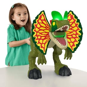 Os jovens fãs do Jurassic World podem reviver momentos épicos de filmes e imaginar novas histórias próprias com este brinquedo de dinossauro Dilophosaurus Imaginext Thrash Attack extragrande da Fisher-Price. As crianças controlam toda a ação feroz deste dinossauro, que ruge para a vida com luzes incríveis, sons, babados expansíveis e ação de cuspir de lançamento de projéteis, assim como nos filmes Com mais de 16 polegadas de altura, este dinossauro Dilophosaurus se eleva sobre sua presa e inspira uma grande brincadeira imaginativa do Jurassic World para crianças em idade pré-escolar. Requer 3 pilhas AA, incluídas. As cores e decorações podem variar.
