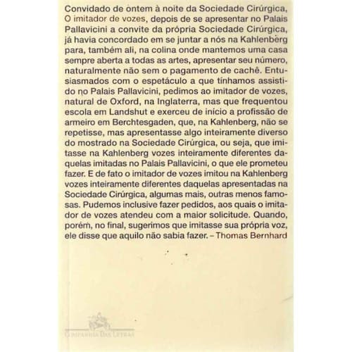 "O Imitador de Vozes" se guia por um acúmulo mais horizontal e variado de situações, uma sucessão desconcertante de incêndios, enforcamentos, desastres naturais, excursões turísticas mal-sucedidas, brigas por heranças e toda sorte de fatos patéticos contados por narradores que misturam espanto e ironia nas frestas de um registro falsamente neutro. Ao final, o conjunto acaba apontando para os tradicionais alvos de Bernhard; a sociedade regida pelas aparências, sob as quais se esconde a memória de um tempo caracterizado por catástrofes políticas e sociais, na qual pouco resta ao homem além da consciência e da revolta contra sua própria condição limitada, mesquinha, muitas vezes ridícula.