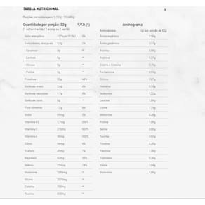Ingredientes: proteínas hidrolisada e isolada do soro de leite thermax690 e provon292 , leite de coco desidratado, glicina, glutamina, taurina, canela cinnamomum cassia , gengibre desidratado zingiber officinale , cisteína, betaglucana de levedura saccharomyces cerevisiae , ascorbato de magnésio, mix de tocoferóis, cúrcuma curcuma longa , bisglicinato de magnésio, urucum, selenometionina, cardamomo elettaria cardamomum , pimenta-vermelha capsiate - capsicum annuum l. , riboflavina-5-fosfato, pimenta-preta piperina - piper nigrum l. , aroma natural extrato de cúrcuma curcuma longa , aromas naturais de cardamomo e coco, estabilizante goma gelana, edulcorante estévia. Não contém glúten.