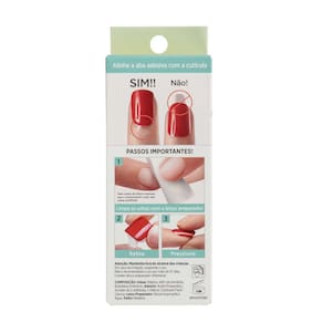 Abra a embalagem e comece selecionando os tamanhos ideais para as suas 10 unhas (caso esteja em dúvida, opte pela opção de menor tamanho). Utilize o lenço preparatório incluso para limpar quaisquer resíduos e garantir uma melhor aderência. Alinhe a aba adesiva à cutícula e, em seguida, retire a película protetora, pressionando firmemente, do meio para os lados. A remoção é super simples, basta retirar gentilmente pelos lados utilizando um pedaço de algodão e acetona.