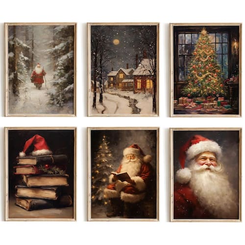 Impressões artísticas de parede de Natal vintage Kizbook, pintura de gravuras de Natal do Papai Noel, pôster de Natal de fazenda, arte de parede de galeria de Natal, impressão de inverno, decoração vintage de Natal para férias, conjunto de 6 (8" x 10" sem moldura)