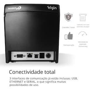 Comunicação: Interfaces de Comunicação: USB + Serial RS232 (DB-9) + Ethernet (Cabos USB e Serial inclusos) 1 | RJ12 female connector for up two drawers (24V, 1A max) Protocolo de comunicação: ESC/POS (Compatível com i9 e i8 Elgin) Códigos de barras: UPC-A / UPC-E / EAN8 / EAN13 / CÓDIGO39 / ITF CÓDIGO 128 / CÓDIGO 93 / PDF417 / QR CODE / INTERCALADO 2/5 *Não suporta ESC/BEMA