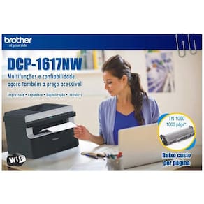 MARCA:BROTHERMODELO:DCP-1617NW ESPECIFICAÇÕES:A Multifuncional Brother DCP-1617NW com Wireless e Rede Cabeada Oferece funções de impressão, digitalização e cópia em um único Equipamento, eficiente e versátil. É ideal para realizar cópias Rápidas e impressão de documentos de texto. Com ela você terá Impressões de qualidade a uma velocidade de até 21ppm, o que permiteMelhorar a eficiência do trabalho diário de um pequeno escritório. Além disso, seu Scanner colorido de alta resolução permite a Criação de cópias digitais de seus documentos importantes. Esse Equipamento é a solução para quem busca funcionalidade a um custo Baixo benefício. ESPECIFICAÇÕES: Principais Características:Velocidade de impressão e cópia de até 21 ppmResolução de 2400x600 dpiImpressora, copiadora e scannerTamanho compacto, ideal para escritórios pequenos ou domésticos.Conexão USB 2.0 de alta velocidade, Wireless e Ethernet Geral Tecnologia de Impressão: Laser eletrofotográfico Velocidade Maxima: Até 21ppm Resolução: Até 2400 x 600 dpi Velocidade do Processador: 200 MHz Memória Padrão: 32 MB Emulação: GDI Duplex: Manual Volume Máximo de Ciclo Mensal: 10000 páginasManuseio do Pepel Capacidade da Bandeja de Papel: 150 folhas Capacidade de Saída do Papel: 50 folhas Tamanhos do Papel: A5 até Ofício Tipos de Papel: Papel normal, fino e reciclado Gramatura de Papel: 65 a 105 g/m² ADF: 10 folhas Cópia Velocidade da Cópia em Preto: Até 21ppm Ampliação / Redução: 25% - 400% Tamanho do Vidro de Exposição: 21,6 x 29,7 cm (A4) Agrupamento de Cópias (2 em 1) Cópia Duplex Automática: Manual Resolução de Cópia: 600 x 600 dpi Opções de Cópia: Impressão N em 1, impressão de pôsteres,Cabeçalho e rodapé, impressão de marca d água, impressão duplexManual, impressão de folhetos Digitalização Digitalização Color e Mono Resolução Óptica do Scanner: Até 600 x 1200 dpi Resolução Interpolada: Até 19200 x 19200 dpi Digitaliza para: Arquivo, Imagem e E-mail Conexões USB 2.0 de alta velocidade Wireless Ethernet Itens Inclusos Equipamento DCP-1617NW Suprimento preto: Toner inicial com rendimento 700 páginas Conjunto de Cilindros: Unidade de cilindro (10000 páginas) Cd-rom Instalação Guia de Configuração Rápida Manual do Usuário Compacta e muito fácil de usar, com a qualidade eTecnologia japonesa. Voltagem 110v