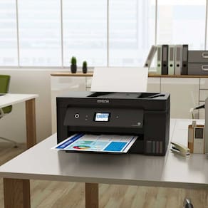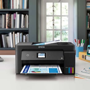 A Epson EcoTank L14150 é uma multifuncional tanque de tinta que proporciona impressões coloridas de tamanho até A3+.