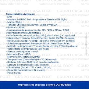 A elgin l42pro full é a solução perfeita para quem busca uma impressora de etiquetas versátil e fácil de usar. Com sua tecnologia de transferência térmica/térmica direta e resolução de 203dpi/300dpi opcional, é possível imprimir diversos tipos de etiquetas com qualidade e precisão, como gôndola, tag, couche, bopp, vinil, poliéster e térmicas, com gap, tarja preta ou contínuo, em diferentes formatos e tamanhos, como quadradas, retangulares e redondas, com várias colunas e muito mais.