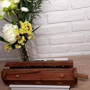 Porta incenso e incensário de madeira com lindos detalhes talhado na madeira. Seu suporte serve para duas vareta de incenso ao mesmo tempo.Possui um guarda incenso na parte inferior.