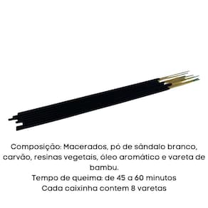 Composição: Macerados, pó de sândalo branco, carvão, resinas vegetais, óleo aromático e vareta de bambu.