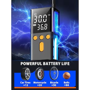BAIPENY Compressor de ar portátil para inflador de pneu, inflador de pneu sem fio 150 PSI, bomba de ar para pneus de carro com exibição digital de dois valores, luz LED, medidor de pressão e função de - Líder em eficiência: o compressor de ar BAIPENY é um inflador de pneu de 150 PSI, excelente em eficiência. Velocidade de enchimento de pneu 4x mais rápida, infla pneus de carros pequenos (25 - 36 PSI) em menos de 1 minuto. Quando você estiver com pressa de sair e descobrir que seu pneu está inflado. Este inflador de pneu portátil para carro coloca você na estrada rapidamente. - Durável e longo: uma vez totalmente carregada, esta bomba de ar elétrica para inflável tem uma capacidade impressionante. Pode inflar 12 pneus de carro, 20 pneus de motocicleta, 30 pneus de bicicleta ou 88 bolas. Ideal para viagens longas ou uso frequente, você não vai se preocupar com a energia da bateria. - Predefinição inteligente e desligamento automático: este compressor de ar inteligente possui uma função de pressão predefinida avançada. Ele pára automaticamente ao atingir a pressão definida. O LCD grande mostra leituras precisas e oferece 4 unidades de pressão (PSI, kPa, BAR, KG/CM). Simplifica a inflação, garantindo precisão e conveniência. - Tamanho de bolso: esta mini bomba de ar para carros pesa apenas 490 g, equivalente ao peso de um suporte de telefone de carro. É incrivelmente compacto, cabe sem esforço sob o assento, porta-bicicletas, porta-luvas ou porta-malas. Este inflador de pneus vem com uma lanterna para emergências noturnas. Ele também funciona como um carregador portátil de emergência, fornecendo energia oportuna para seus dispositivos. - 4+N modos inteligentes: este compressor de ar sem fio oferece 4+N modos inteligentes (carro, motocicleta, bicicleta, bola, definido pelo usuário). Funciona com ruído 50% menor, atende a diversas necessidades de inflação sem perturbar ambientes silenciosos, proporcionando uma experiência de usuário confortável para todos os tipos de veículos.