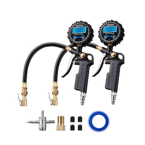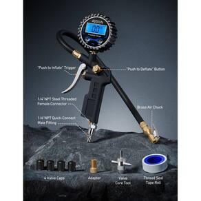 AstroAI Medidor digital de pressão de pneu com inflador, mandril de ar de 250 PSI e acessórios de compressor - Precisão avançada: calibrado profissionalmente para sempre retornar uma leitura precisa dentro de 1% da pressão exata do seu pneu. Chega de adivinhar! Mede com precisão em uma faixa de 0-250 PSI (0-17,2 bar; 0-1724 Kpa; 0-17,5 kg/cm^2). Meias para homens. - Maior segurança: pneus devidamente inflados proporcionam melhor desempenho em todas as condições climáticas, diminuem a probabilidade de furadeiras, explosões e colisões; aumente seu MPG, economize dinheiro no desgaste de combustível/pneu e dirija com mais segurança. - CARACTERÍSTICAS TUDO EM UM: medidor de pressão de pneu AstroAI inclui um inflador, mandril de travamento reto, manômetro, mangueira e válvula de sangria, tudo em uma unidade com função de esvaziamento, inflação, verificação da pressão do pneu. Compatível com saídas de compressores de ar NPT de ¼" e ½". - Estrutura superior: Feito com aço inoxidável resistente e componentes de latão de alta qualidade, nosso inflador oferece confiabilidade e desempenho duradouros. Seu mandril à prova de vazamento permite que o inflador lide com a pressão de carros, caminhões, motocicletas, SUVs, veículos off-road, trailers e muito mais. - Economia de bateria: liga automaticamente quando o ar pressurizado é detectado e desliga após 20 segundos de inatividade.