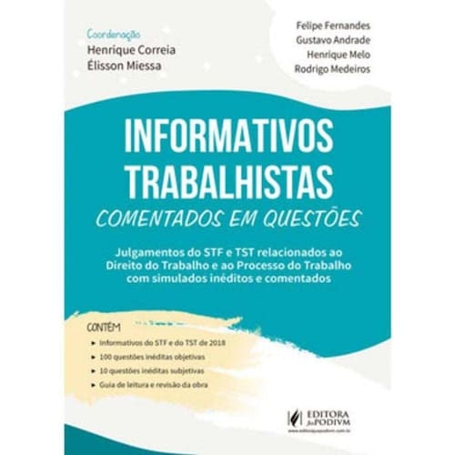 O LEITOR ENCONTRARA:Informativos do STF e do TST de 2018100 questoes ineditas objetivas10 questoes ineditas subjetivasGuia de leitura e revisao da obraPOR QUE ESCOLHER O LIVRO INFORMATIVOS TRABALHISTAS COMENTADOS EM QUESTOESTendo como norte o tripe estud