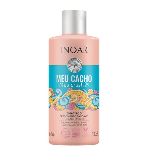 Shampoo para cabelos ondulados, cacheados e crespos. Inoar Meu Cacho, Meu Crush Shampoo limpa suavemente e ajuda no crescimento.