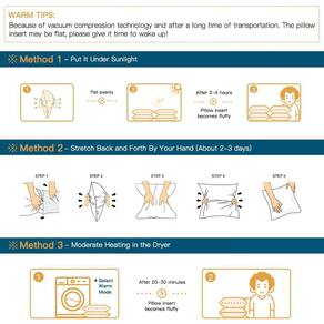 Dicas quentes: O inserto de almofada é embalado em compressão a vácuo. Depois de abrir a embalagem, siga os três métodos nas instruções para deixar o travesseiro macio. Isso criará um maravilhoso tempo de descanso para você.