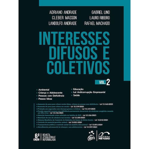 Organizada em dois volumes, a obra Interesses Difusos e Coletivos aborda os principais temas tanto do Direito Material Coletivo como do Direito Processual Coletivo. Nos assuntos controversos, são expostas as diversas posições da doutrina e da jurisprudência, com destaque para as orientações do Superior Tribunal de Justiça e do Supremo Tribunal Federal, quando existentes. Para facilitar a compreensão da matéria, especialmente nos temas mais complexos, são citados inúmeros exemplos de casos práticos, além de gráficos e esquemas. Este segundo volume, organizado em sete capítulos, abrange Direito Ambiental, Direito da Criança e do Adolescente, Direitos da Pessoa com Deficiência, Direitos da Pessoa Idosa, Direito à Educação, Lei Anticorrupção Empresarial e Direito à Saúde. Além disso, conta com vários recursos didáticos, como questões para treino interativas e casos práticos com espelhos de resposta, que se encontram no Material Suplementar, além de videoaulas em todos os capítulos, dispostas em QR Codes.