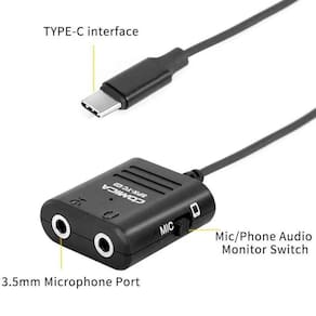 Características: 1. Compatível com ambos os 3.5 milímetros trs & convertido para type-c trrs plugue de áudio; 2. Support real-time e interruptor de monitor de reprodução; 3. High-end terminal de codec de áudio, preciso e durável; 4. Material tpe cabo feito, durável e confortável; especificação: conexão de saída: type-c usb 2.0 conexão de entrada de microfone: 3.5 milímetros ambos trs/trrs monitor de interface: 3.5 milímetros p2 taxas de amostragem: 48 khz/441 khz profundidade de bits: 16 bit requisitos do sistema operacional: android 5.0 ou acima linha comprimento: 0.3 m temperatura de trabalho: 0 Para 50 Conteúdo: 01- comica cvm-spx-tc adaptador de áudio usb tipo c para p2 de 3,5 mm para microfone e fone