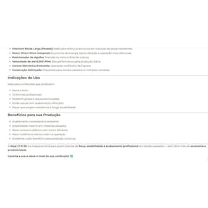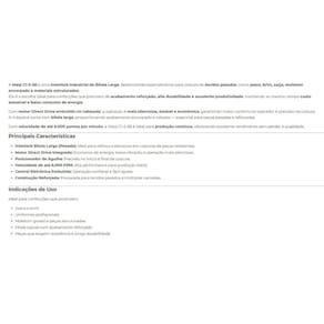 Interlock bitola larga (pesada) com motor posicionador, Direct-Drive (central eletrônica embutida). Velocidade de 6000 ppm. Bitola de 5mm+6mm de chuleado=largura total de 11mm. Certificação NR-12. Acompanha bancada com rodinhas.Funções