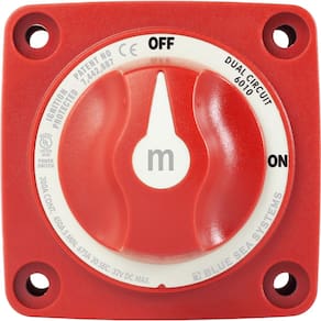 - Blue Sea Systems Interruptor de bateria M-Series Dual Circuit, número de peça 6010, é um interruptor de circuito duplo. Alterna simultaneamente dois bancos de bateria isolados