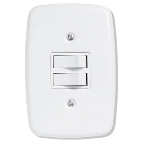 Características Principais do Produto: Marca: Pluzie Cor: Branco Quantidade de teclas: 2 teclas Com placa: Sim Material: Placa e tecla em Abs, corpo em poliestireno e contatos em latão Tipo de ligação: 1 Simples e 1 paralelo Corrente: 10A Tensão em V: 250V~