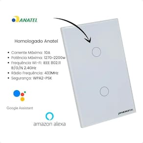 Revendedor Autorizado com . O Wi-Fi pode ser controlado por meio de um aplicativo via Wi-Fi, permitindo que os usuários liguem/desliguem remotamente luzes ou dispositivos conectados separadamente de qualquer lugar, a qualquer momento. Agendamentos: É possível criar cronogramas programados/contagem regressiva para ligar/desligar automaticamente os dispositivos no horário especificado. Isso garante uma grande economia de energia para sua residência. Controle de dispositivos inteligentes: Além de controlar as luzes, você também pode configurar os botões para acionar cenas inteligentes em seus dispositivos inteligentes, ligando, por exemplo, vários dispositivos ao mesmo tempo, como TV, luzes etc. Controle por voz: Por meio das integrações com ALEXA e GOOGLE HOME, é possível controlar todos os seus dispositivos individualmente usando comandos de voz. É simples e prático. virtual: Chega de fios. Com 2 ou mais Interruptores Wifi PRO você pode configurar paralelos virtuais, controlando sua iluminação de maneira eficiente e prática. Não requer HUB: Conectando-se diretamente via Wifi, não é necessário nenhum tipo de hub para usar o Wifi PRO, o que é perfeito para aqueles que desejam começar a automação residencial. Informações importantes: Este dispositivo é técnico e requer um conhecimento básico para a instalação. Caso você não possua esse conhecimento, recomendamos que chame um eletricista. Além disso, o dispositivo requer uma rede wifi de 2,4 GHz para funcionar corretamente. Aplicativos compatíveis para celular: - Smart Life; - Tuya; - Nova Digital; Sistemas de voz compatíveis: - Google Home; - Alexa; - Siri; - Fabricante: Hangzhou Tuya Information Co,.; - Certificação ANATEL: 07871-21-11765; - Estilo: 2 Botões; - Modelo: LITE-S - Acabamento: Sem revestimento; - Material:ABS V0 + painel de vidro temperado; - Formato: Quadrado; - Tipo de fonte de energia: Energia elétrica; - Voltagem: 110 Volts, 220 Volts; - Corrente máxima: 10A; - Potência Máxima: 2200W; - Frequência Wi-Fi: IEEE 802. 11 b/g/n 2.4ghz. Conteúdo da embalagem: 01 - Touch com 2 Botões; 01 - Manual de Instalação; 02 - Parafusos. Homologação Anatel: 003052112961 Marca: Não Informado